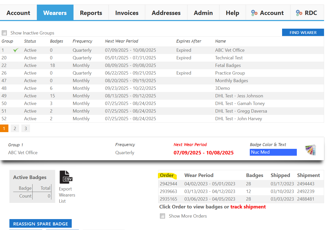 Another way to confirm your order has been placed is to review the orders list on the 'Wearers' tab. Orders are displayed on the right side of the page below the 'Next Wear Period' date shown in red. Simply select an order number to view the details.