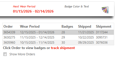 Hint: When looking for a normal order vs an extra pay attention to the wear period and number of badges in the order. This can help you better understand which shipment was issues as your next wear period order and which are for extra badge ordered.