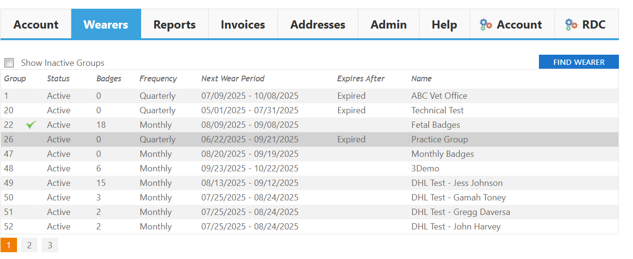 Groups are accessible from the 'Wearers' tab in MyRadCare. Directly beneath this tab, your group list is displayed. A green check mark highlights your current group. To switch to a different group, click on the desired group number.